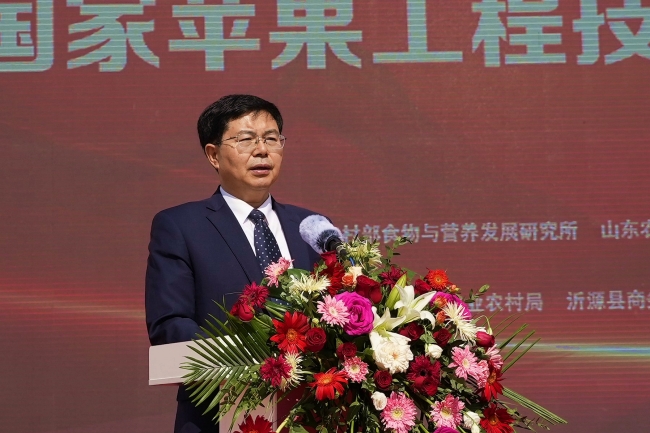 冷畅俭在致辞中指出,山东农业大学作为省属高校“双一流”建设排头兵、服务乡村振兴先锋队,着力推进高质量发展,构建了以小麦育种全国重点实验室、国家苹果工程技术研究中心、土肥高效利用国家工程研究中心等国家级平台为代表的科技创新平台体系,牵头承担了国家重点研发计划“苹果化肥农药减施增效技术集成研究与示范”等一系列重大科技任务。他表示,沂源苹果产业承担着乡村振兴的重任,承载着产业创新的理想和科技突破的厚望,学校将组织高水平研究队伍,深入攻关果树优良品种选育、高效栽培技术集成、老果园更新改造、果品加工及品牌打造等重点任务,用科技创新守护沂源“芯”,为推动沂源经济社会高质量发展贡献山农力量。
