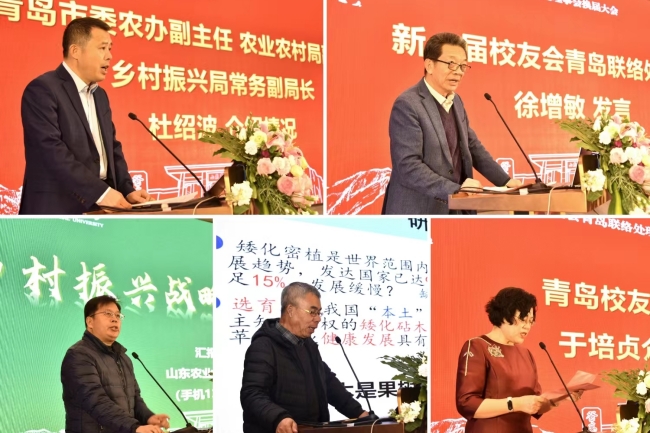 山东农业大学校友会青岛联络处理事会换届大会上,嵇景涛介绍了山东农业大学117年发展历程中校友培养情况,希望新一届校友联络处理事会发挥好“联络员”、“宣传员”和“服务员”作用,凝心聚力、齐头并进,不断提高学校的知名度和美誉度,为一流农业大学建设贡献更为强劲有力的校友力量。青岛校友联络处秘书长、77级农学专业校友于培贞简要介绍青岛校友工作情况和换届工作筹备情况;新一届青岛校友联络处会长徐增敏发言,表示要发挥好桥梁和纽带作用,当好参谋助手,带领广大青岛校友继续助推地方经济社会高质量发展。