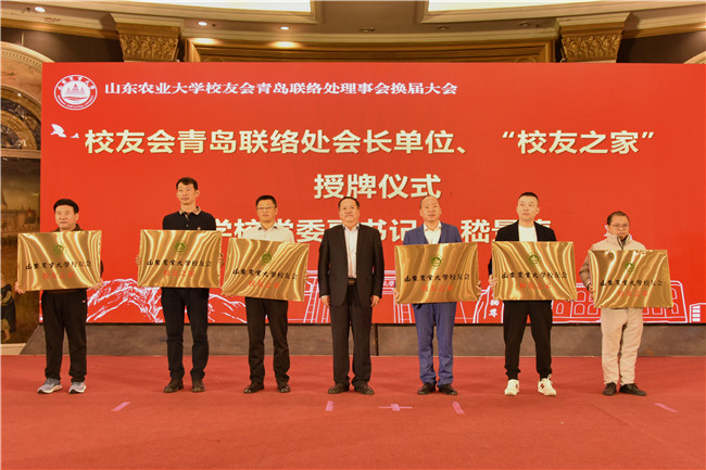12月9日,山东农业大学助力青岛乡村振兴论坛暨山东农业大学校友会青岛联络处理事会换届大会在青岛举行。山东农业大学党委书记徐剑波,青岛市人大党组副书记、副主任李红兵出席会议,共同为山东农业大学校友会青岛联络处揭牌。山东农业大学党委副书记嵇景涛主持论坛,并为校友会青岛联络处会长单位、“校友之家”单位授牌。