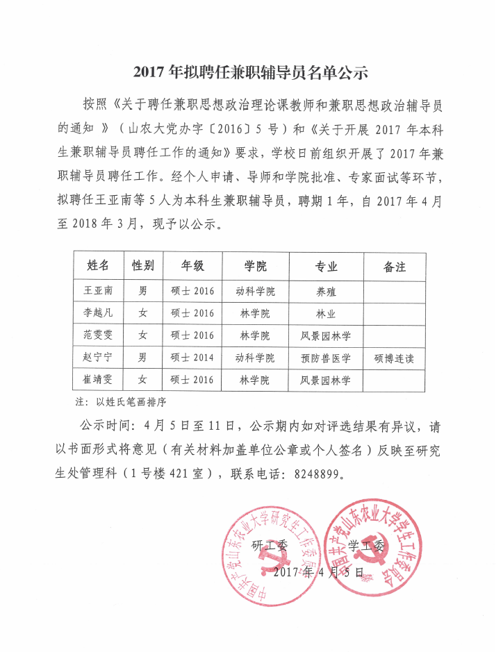 2017年拟聘任兼职辅导员名单公示