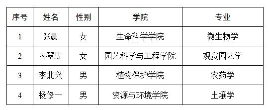 根据山东农业大学《关于开展2017年先大奖学金、 先正达奖学金评选工作的通知》(山农大学通字〔2017〕58号)的精神和要求,经过个人申请、各学院初评、学校统一投票评选,共评选出获得先正达奖学金的4名博士研究生,现将评选结果进行公示。