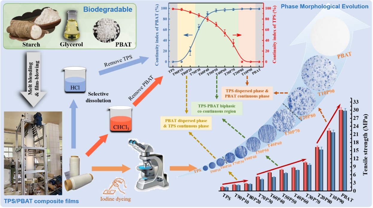 塑料由于质轻价廉和性能优异等优点一直是包装行业的关键材料之一,传统石油基塑料由于其难以降解性和回收处理不到位等原因带来了严重的环境问题,近年来可持续性、可工业化和可降解性正在成为一次性塑料制品领域的重要考虑因素。聚己二酸-对苯二甲酸丁二醇酯(PBAT)是一种市售的生物降解聚合物,具有类似于低密度聚乙烯(LDPE)的高柔韧性和力学性能,但其较高的市场价格限制了大规模的推广应用。从商业角度来看,将PBAT与低成本的天然高分子聚合物(如热塑性淀粉(TPS))共混是制备生物降解材料的实用途径。然而,疏水性PBAT和亲水性TPS之间经常发生不混溶和相分离,这极大地影响复合材料的力学性能,因此TPS/PBAT共混体系的相组成和界面相互作用引起了科学界的广泛关注。