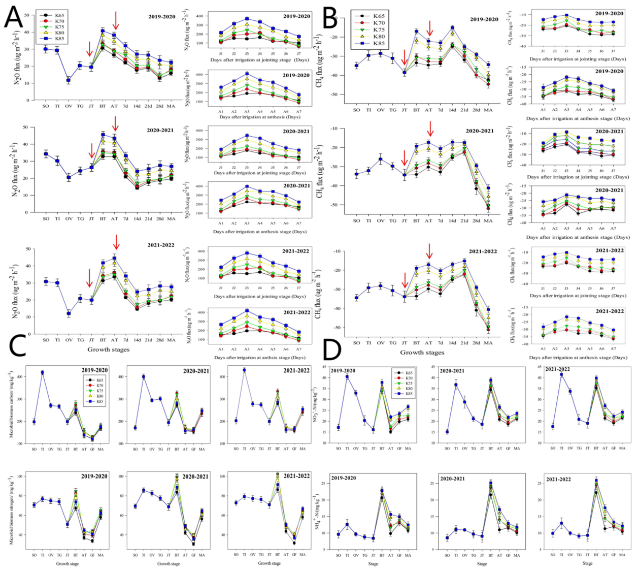 农田温室气体排放量占全球人为排放总量的13.8%,华北平原作为我国小麦主产区之一,随着人口增长对小麦产量需求的增加,农业生产过程中温室气体排放量持续增加。此外,由于降水时空分布不均导致该地区冬小麦生产主要依靠地下水进行补充灌溉,传统高耗水的灌溉方法加剧了水资源短缺的现状。因此,探究减少温室气体排放同时保证小麦产量的高效节水灌溉理论与技术对华北平原小麦生产的可持续发展具有重要意义。