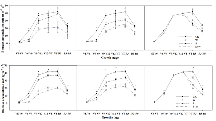 图3. 不同生育时期遮阴、淹水及其复合胁迫对夏玉米干物质积累速率的影响