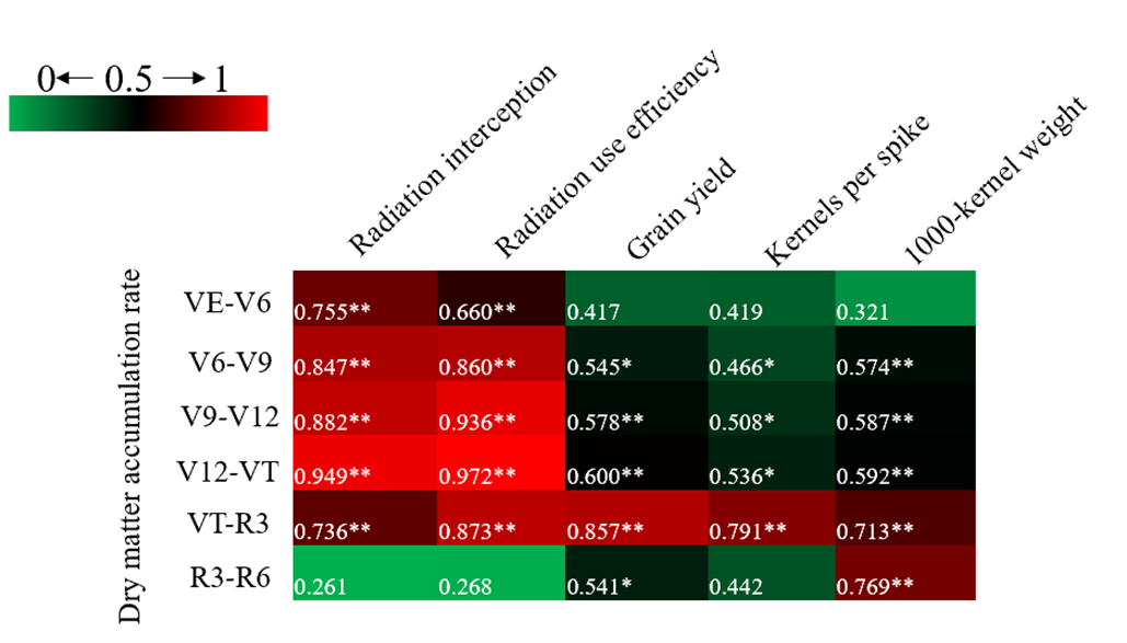 图1. 干物质积累速率与光截获、光能利用和产量构成因素的相关性分析