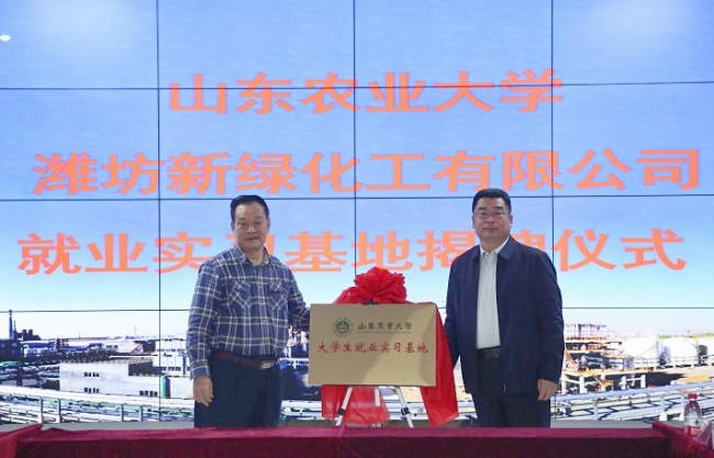 近日,山东农业大学大学生就业实习基地签约揭牌仪式在潍坊新绿化工有限公司举行。学校党委常委、副校长高立明与新绿化工董事长赵焱共同为基地揭牌。