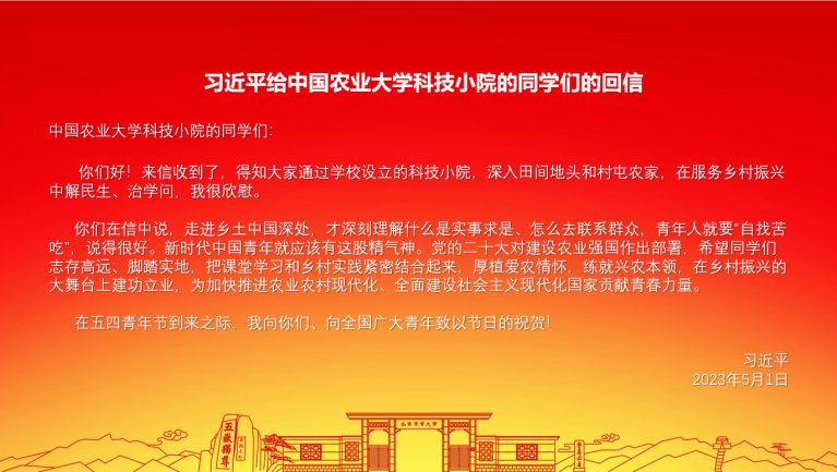 中共中央总书记、国家主席、中央军委主席习近平近日给中国农业大学科技小院的同学们回信,在山东农业大学广大青年学生中引起热烈反响。在全国重点实验室、在学校各个科技小院实验站点、在青年学生活动场所...广大青年学生自发组织起来认真学习、广泛热议回信精神,同学们纷纷表示,要牢记习近平总书记殷殷嘱托,志存高远、脚踏实地,厚植爱农情怀,练就兴农本领,在服务乡村振兴战略,推进农业农村现代化建设,全面建设社会主义现代化国家的实践中贡献青春力量。