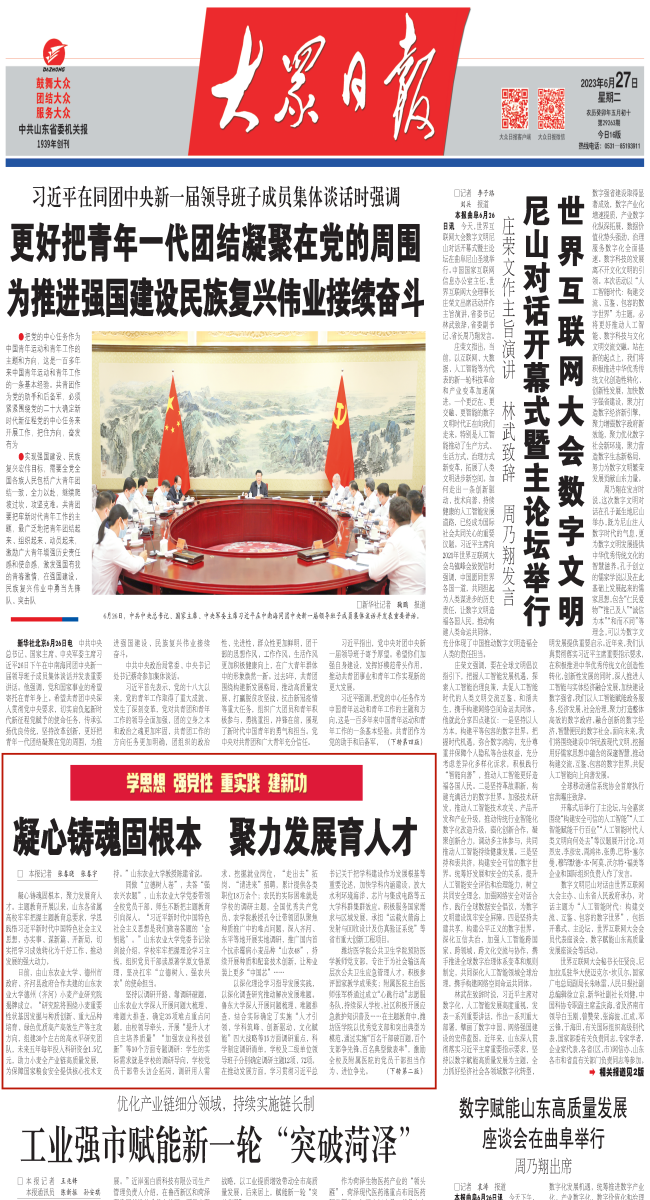 6月27日出版的大众日报在头版“学思想 强党性 重实践 建新功”专栏刊发文章《凝心铸魂固根本 聚力发展育人才》报道我校深入开展学习贯彻习近平新时代中国特色社会主义思想主题教育的典型做法。文章指出,山东农业大学同做“立德树人卷”,共答“强农兴农题”,学校党委带领全校党员干部、师生不断把主题教育引向深入。文章围绕学校坚持以调研开路、靠调研破题,深入开展问题大梳理、难题大排查进行深度报道。相关报道如下: