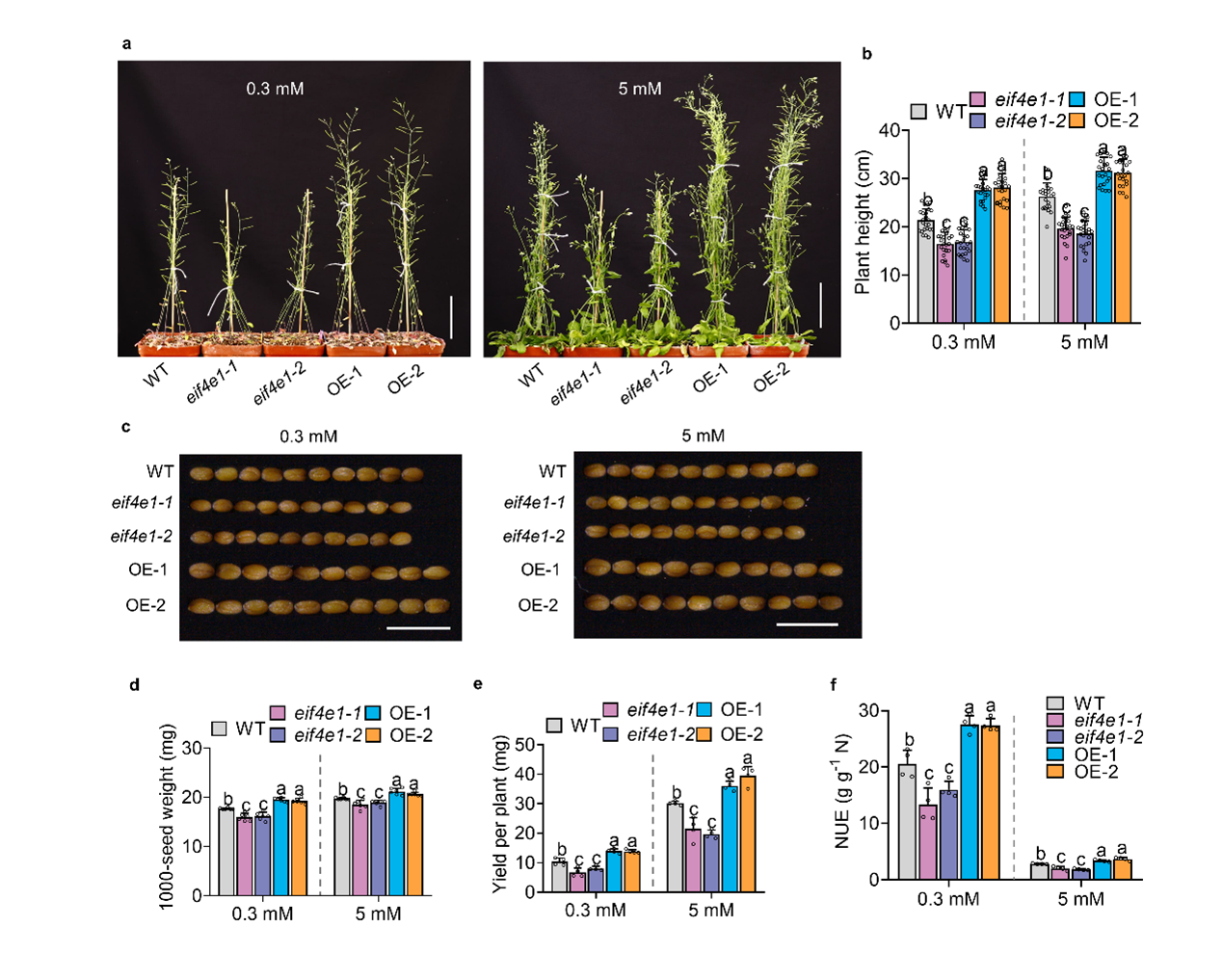 图2 eIF4E1能够促进拟南芥的生长,提高产量和NUE