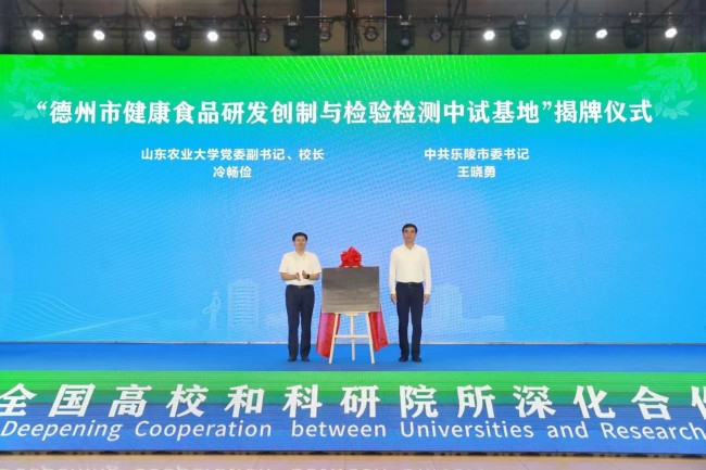 近日,学校受邀参加2023年全国高校和科研院所深化合作乐陵行活动。学校党委副书记、校长冷畅俭与乐陵市委书记王晓勇共同为“德州市健康食品研发创制与检验检测中试基地”揭牌。乐陵市委副书记、市长王峰陪同参加相关活动。