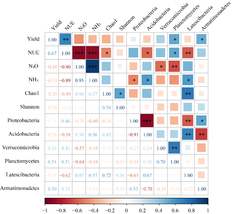 该研究表明,施氮方式、氮肥类型和施氮量均对N2O排放通量和NH3挥发造成显著影响(图2)。微喷水肥一体化显著降低了夏玉米季N2O排放通量和NH3挥发量。与传统施肥方法相比,微喷水肥一体化施用尿素处理的总NH3挥发量和累积N2O排放量分别显著降低了19.0%和34.2%。与施用尿素处理相比,施用UAN进一步降低了N2O累积排放量和NH3挥发量。同样,NH3挥发和累积N2O排放通量也受施氮量的显著影响。此外,施氮影响细菌群落的多样性和丰富度。在传统施肥方法下,施氮量对细菌多样性和丰富度没有显著影响。然而,在微喷水肥一体化条件下,细菌α多样性指数对施氮量的响应随氮肥类型的不同而不同。施氮量对细菌群落α多样性的影响也因施氮方式的不同而不同,微喷水肥一体化减氮处理更利于保持细菌群落多样性和丰富度。与此同时,施氮增加了变形菌门的相对丰度,降低了酸杆菌门的相对丰富度。与尿素相比,UAN处理显著增加了土壤中疣微菌门和浮霉菌门的相对丰度。与传统施肥处理相比,在微喷水肥一体化施用尿素增加了变形菌门的相对丰度,降低了酸杆菌门的相对丰度(图2)。相关性分析进一步表明,细菌群落多样性以及门水平差异微生物等与夏玉米产量和气态氮损失均具有相关性(图3)。总之,微喷水肥一体化施用UAN可以提高夏玉米产量,节省氮肥,是一种有效的农业可持续的氮肥管理措施。