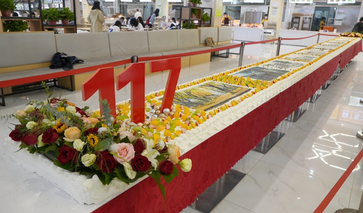 学校后勤管理处精心设计、倾情制作11.7米巨型庆生蛋糕,上有校徽、校训、“117”校庆标识等元素。琳琅精致的水果装点、连绵不绝的奶油浪花象征着一代又一代“后浪们”涌入山东农业大学又奔赴远方,代表着学校对莘莘学子们的美好祝福和期盼。蛋糕正上方由学校标志性景物手绘图组成,两侧两束盘花,寓意着山东农业大学117年不懈奋斗、砥砺前行,向着一流农业大学奋勇前进的精神风貌。