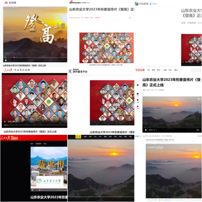 10月24日,在“万名学子联万村,我为家乡做贡献”大调研成果发布暨总结表彰会上,我校2023版形象宣传片《登高》首映。充满力量的语言、生动质感的画面、磅礴厚重的配乐,让现场500余名观众通过一场视听盛宴切身感知了山东农业大学底蕴深厚的百年办学历史、桃李群芳的人才培养成就、硕果累累的科研创新成绩和全体农大人奋勇登高、争创一流的信心与决心。同时,学校通过融媒宣传渠道向全网推介宣传片。据统计,截至全网推送24小时内,包括人民网、央视频、全国党媒信息平台、闪电新闻等新闻客户端和微信、微博、抖音、B站、头条等新媒体平台上已收获点击播放量超过150万,引起社会各界广泛关注和热烈反响。
