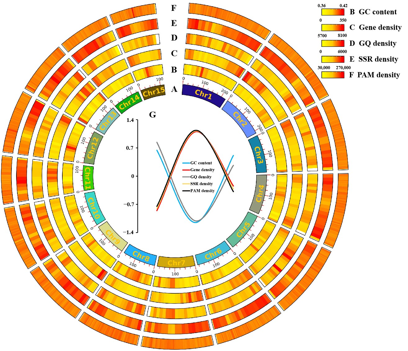 CRISPR/Cas9是一种高效的基因组编辑工具,茶树基因组中编辑位点的鉴定及潜在影响因素尚未得到研究。在本研究中,利用生物信息学方法鉴定shuchazao基因组中包括编辑位点、simple sequence repeats (SSR)、G-四链体、基因密度的特征及其关系。在基因组中共鉴定了248,134,838个潜在的编辑位点,观察到AGG、TGG、CGG、GGG、NGG五种PAM类型,其中66,665,912个被发现是有特异性的,它们存在于基因所有结构元件中。联合分析中在染色体中发现了GC含量、GQ密度、PAM密度高相反基因密度、SSR密度低的特征区域,并发现该区域与次生代谢物和氨基酸生物合成途径相关。所鉴定的编辑位点与影响元件SSR标记为茶树功能研究和分子育种提供了有价值的工具,也给予了其他作物育种参考。