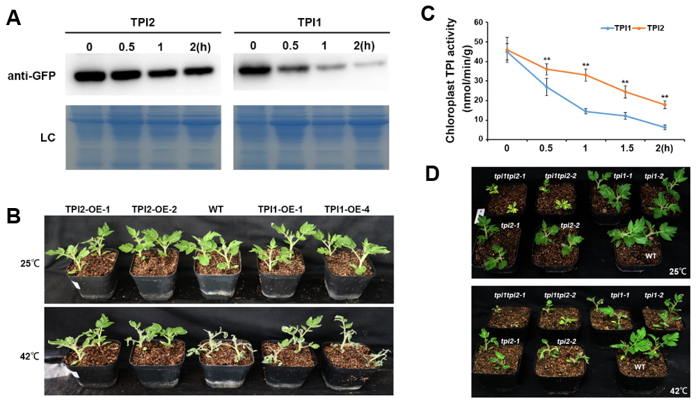 叶绿体磷酸丙糖异构酶(TPI)是碳同化过程中的关键酶,其在高温胁迫下的稳定对于光合作用的维持十分重要。番茄中存在两个TPI同源蛋白:SlTPI1和SlTPI2,两者在正常生长条件下功能冗余:tpi1 tpi2双突株系中光合蛋白损失严重,而tpi1或tpi2单突变体不具有明显表型。但在高温胁迫下,与SlTPI1相比,SlTPI2具有更好的热稳定性。