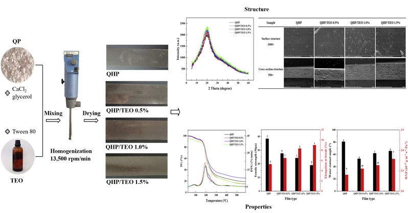 近年来,由于石油基包装材料对环境问题和食品安全产生了严重的负面影响,生物聚合物基食用包装材料的开发受到了极大的关注。果胶由于其无毒性、可降解性和良好的凝胶性等被认为是一种潜在的成膜材料。季铵盐改性具有一定抑菌活性。另外,由于微生物引发的食品安全问题以及合成抗菌剂带来的耐药性问题,含有天然抗菌剂的包装膜的制备已成为研究热点。百里香精油(TEO)是植物次生代谢产物,安全无毒,对多种细菌表现出有效的抗菌能力。本研究以山楂碎片为原料,制备季铵盐化山楂果胶(QHP)/TEO复合薄膜,研究不同浓度的TEO对QHP薄膜结构、理化性能、抗氧化性能和抗菌性能的影响。研究证实TEO对薄膜有增塑作用,提高了薄膜的断裂伸长率。复合薄膜表现出较高的紫外线屏蔽、抗氧化和抗菌性能。研究结果将为QHP/TEO复合薄膜在食品包装中的潜在应用提供理论基础,为食品包装行业提供了新的材料,同时拓宽了果胶在食品工业中的应用。