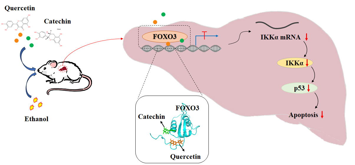 该研究发现槲皮素与儿茶素联合使用,显著增强了大鼠肝脏抵御酒精诱导的氧化应激损伤的能力,并通过共同抑制IKKα/p53,激活Nrf2信号通路发挥作用。其中,IKKα是槲皮素与儿茶素协同抗氧化应激中的关键负调控因子,二者通过协同抑制IKKα基因转录增强抗氧化应激作用。而FOXO3结合IKKα启动子序列调控IKKα转录。槲皮素与儿茶素通过共同结合在FOXO3蛋白DNA结合域的不同位点,协同抑制FOXO3-IKKα的结合,进而抑制IKKα的转录表达及其下游基因表达,从而共同增强细胞抗氧化应激作用。