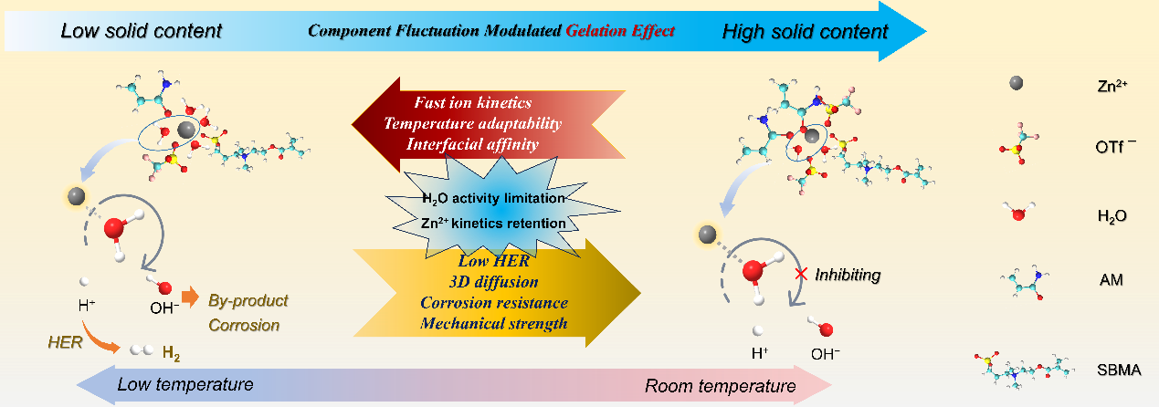 Shanguo Ji†, Hao Luo†, Shuo Qin, Xinyue Zhang, Yuanyuan Hu*, Weiwei Zhang, Jianchao Sun*, Jing Xu, Haijiao Xie, Zhenhua Yan and Kai Yang*, Component FluctuationModulated Gelation Effect EnableTemperature Adaptability in Zinc Ion Batteries[J]. Adv. Energy Mater. 2024, 2400063.