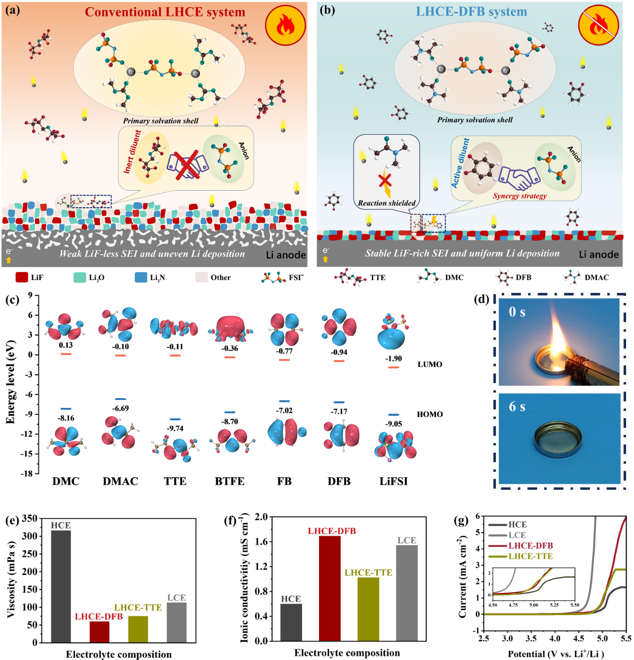 由高比容量锂金属负极和高压富镍正极组成的锂金属电池具有超高的理论能量密度(~500 Wh kg−1),是下一代二次电池的理想选择。针对传统易燃碳酸酯电解液电化学稳定窗口窄,与金属锂负极匹配存在的相容性差、SEI膜不稳定、枝晶生长等问题,本研究采用具有高LiF生成活性的1,2-二氟苯(DFB)作为活性稀释剂来调控以N,N-二甲基乙酰胺(DMAC)为阻燃性溶剂的局部高浓度电解液(LHCE-DFB)。DFB能够与双氟磺酰亚胺(FSI-)阴离子协同构建坚固的富含LiF固体电解质界面膜(SEI)和正极电解质界面膜(CEI),增强了锂金属负极和NCM811正极的界面稳定性。相比于常规局部高浓度电解液易燃的醚类和碳酸酯溶剂,DMAC具有廉价、阻燃性能良好的优点,DMAC有效提高了LHCE-DFB的阻燃性能,LHCE-DFB的自熄灭时间为0 s g−1。DFB的强稀释作用使LHCE-DFB粘度显著降低(59.4 mPa s),离子电导率显著提高(1.69 mS cm−1),同时浸润性也得到显著提高。LHCE-DFB具有高电化学稳定窗口(4.96 V)。该研究工作为安全高能电池电解液的设计提供了一种有前景且广泛适用的活性稀释剂-阴离子协同策略。