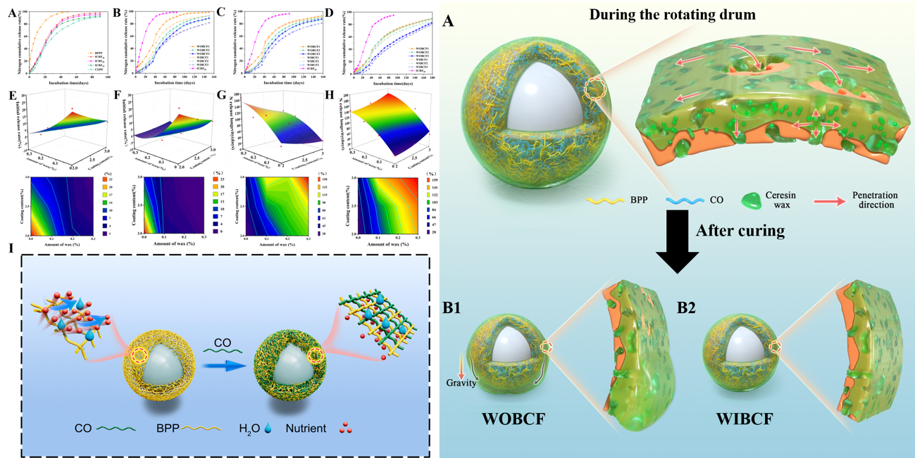 以生物基聚酯多元醇(BPP)为基础制备聚氨酯膜材,低粘度蓖麻油(CO)为改性剂,降低BPP的粘度,制备了互改性涂层控释肥料(ICRFs),以防止喷枪堵塞。在此基础上,通过微晶蜡(CW)改性制备了疏水和致密蜡基包膜肥料(WBCF),以解决包膜过程中肥料颗粒之间的粘附和撕裂难题,WBCF表现出显著的控释特性,只需要3%的涂层材料,氮(N)释放寿命接近180天。通过蜡内外层添加和去除对照,揭示了蜡能够在膜壳中渗透固化以调控微孔的养分控释机制。