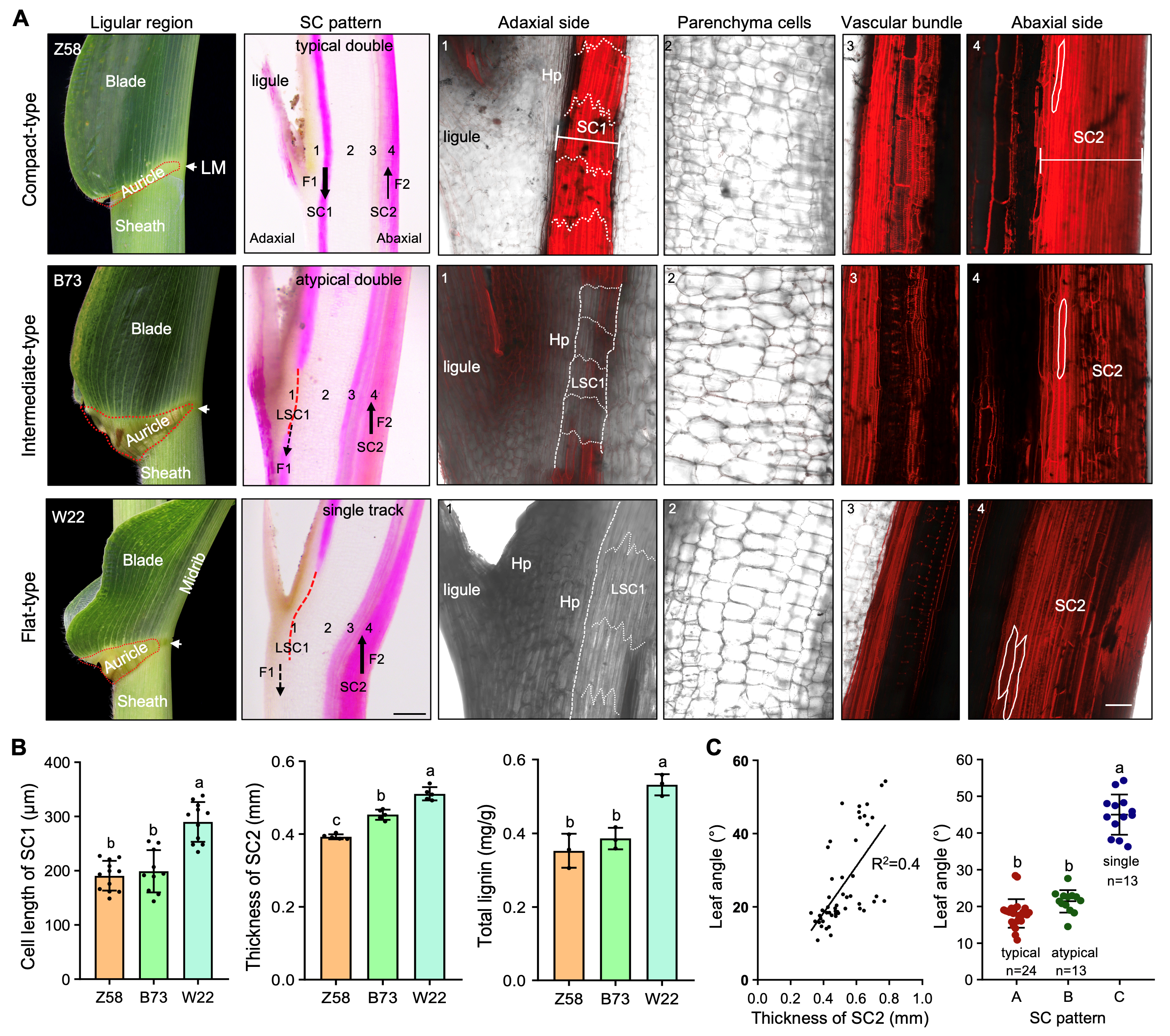 叶枕近轴厚壁细胞是由皮下细胞特化而来。在厚壁细胞的特化过程中,其细胞长度和木质化程度的差异直接决定了茎叶夹角的大小,进而影响了植株整体的紧凑程度。近轴厚壁细胞中木质素的定向沉积,可能通过抑制细胞持续伸长和增强机械强度来限制茎叶夹角增大。