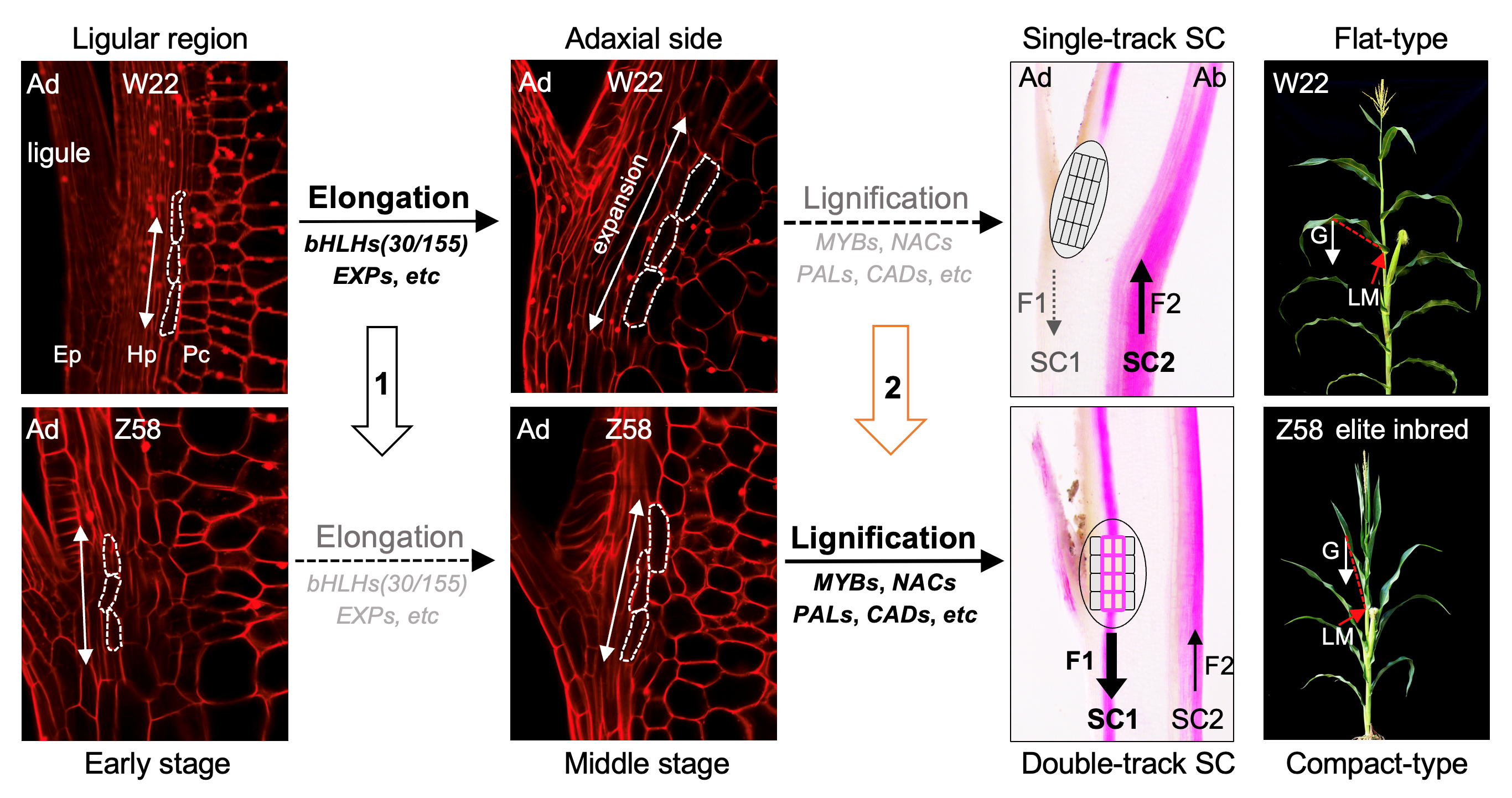 图1. 玉米叶枕近轴侧细胞伸长及木质化影响叶夹角建成