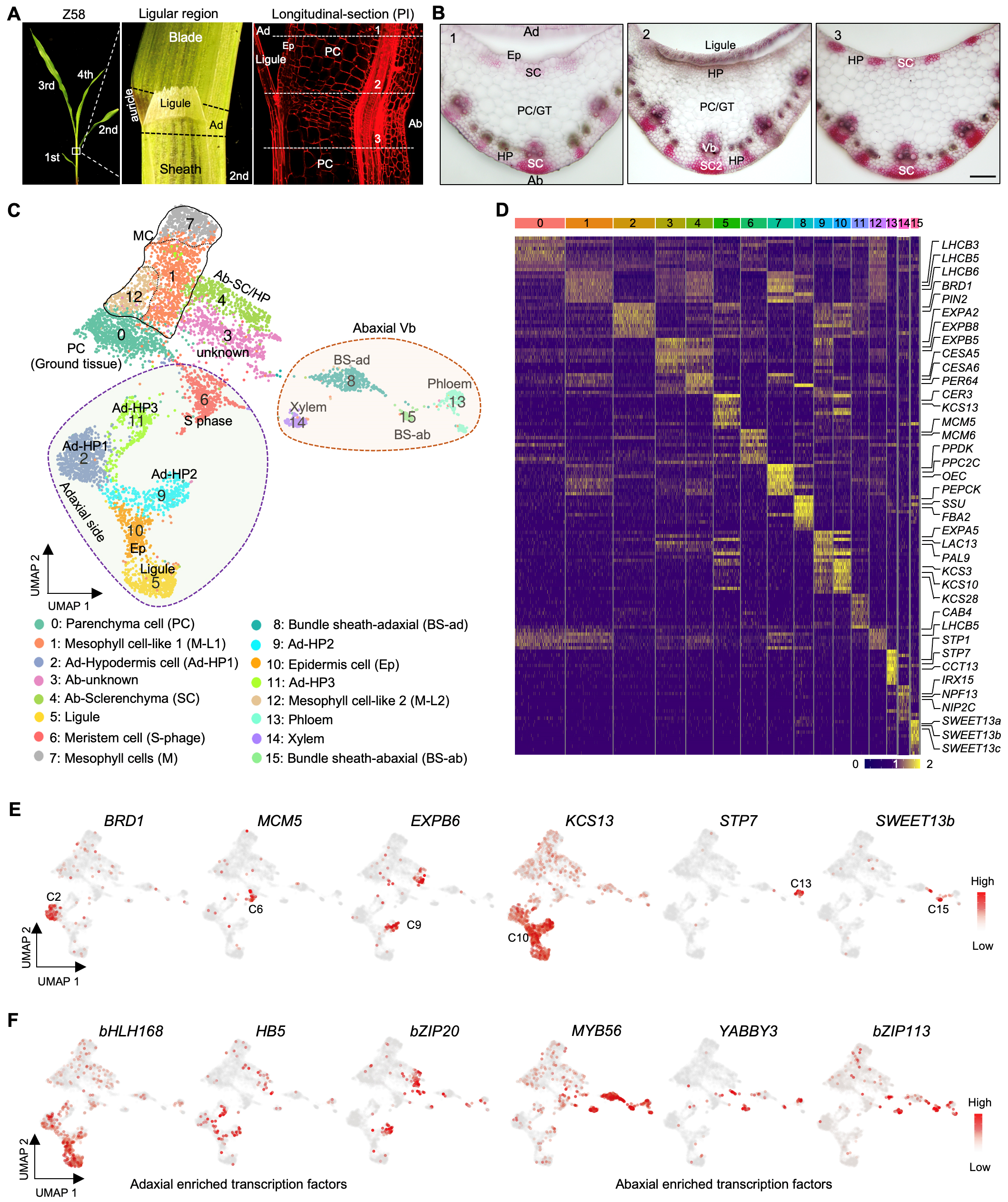 图2. 单细胞转录组揭示玉米叶枕区域的细胞异质性