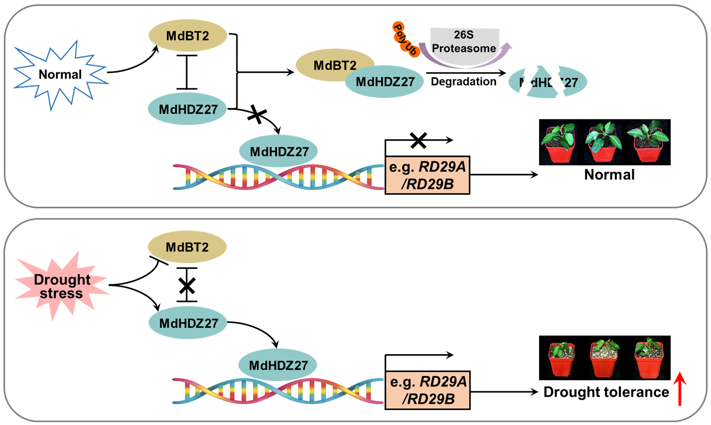 分子生化分析表明,MdHDZ27直接结合并激活MdRD29A和MdRD29B的启动子。此外,体外和体内实验显示,MdBT2通过泛素/26S蛋白酶体途径与MdHDZ27相互作用并使其泛素化。该泛素化修饰的发生,导致MdHDZ27的降解,并削弱MdHDZ27对MdRD29A和MdRD29B的转录激活作用。本研究进一步利用一系列转基因实验,进一步阐明MdBT2和MdHDZ27之间的作用关系及相互作用对苹果植株抗旱性的影响。