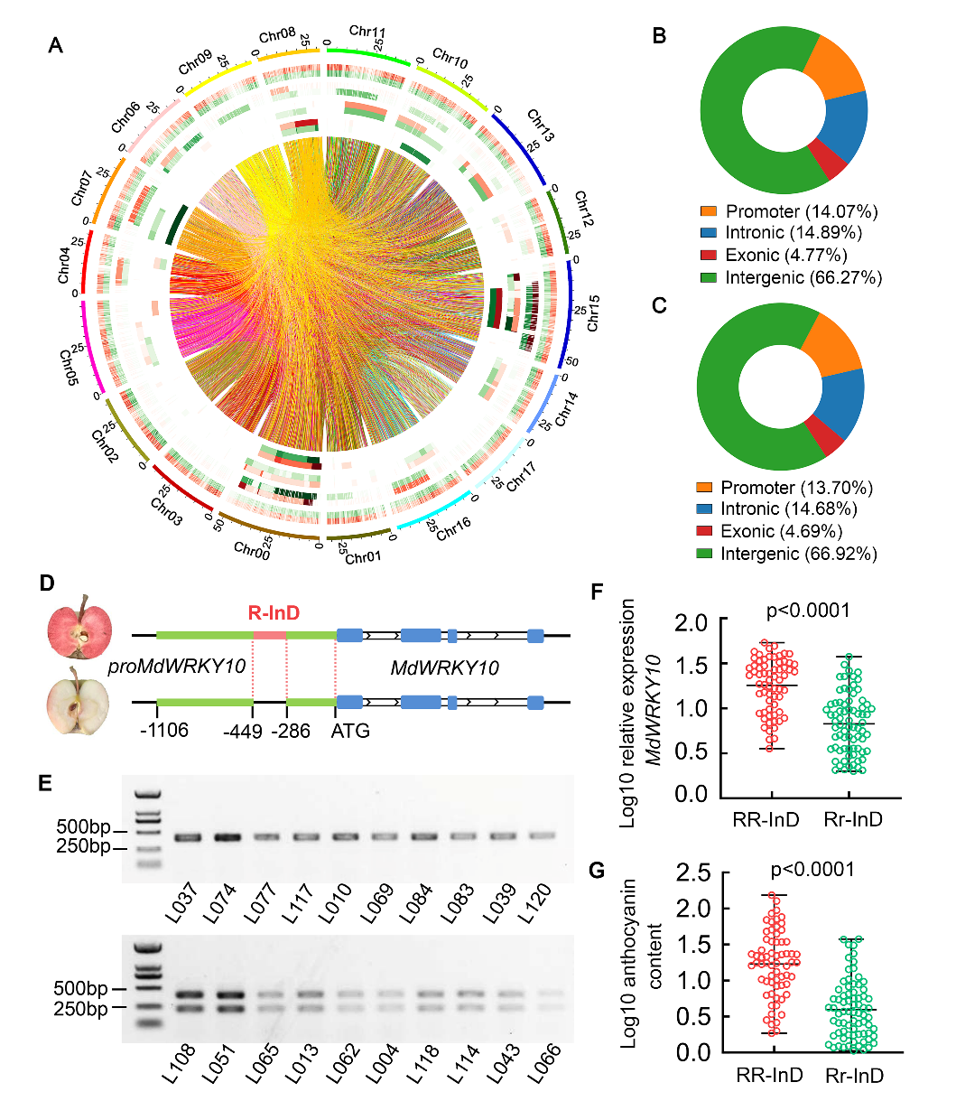 陈学森教授团队已开展红肉苹果育种研究工作20年,创制出全红肉苹果优异种质CSR6R6,该株系为纯合的R6R6:MdMYB10基因型。团队进一步将R6R6红肉种质与R1R1白肉栽培品种杂交构建了杂种分离群体。研究表明,杂交分离群体中140个单株均为R6R1:MdMYB10杂合基因型,但其果肉的红色程度与花青苷含量却差异显著。显然,R6:MdMYB10基因型的差异不足以解释苹果红肉表型遗传多样性的变化。为进一步探究苹果红肉性状的遗传机制,团队进一步以群体中存在极端表型的全红肉和非红肉苹果为试材探究了不同红肉株系基因组之间的结构变异(SVs)。在红肉和非红肉苹果基因组之间共鉴定出包括插入、缺失、重复以及倒置在内的125, 451个SV。结果发现,在红肉苹果基因组的MdWRKY10启动子区中存在一个163bp长的InDel,命名为R-InD。群体中红肉株系MdWRKY10启动子表现为RR-InD纯合型,而非红肉株系同时含有一条长R-InD带和一条短R-InD缺失带,表现为Rr-InD杂合型。