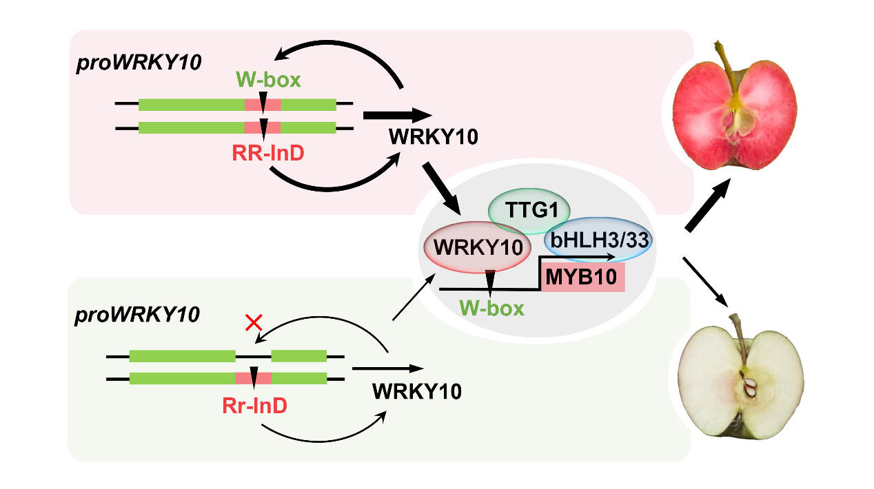 近日,国际知名期刊Advanced Science在线发表了园艺科学与工程学院陈学森教授团队和康奈尔大学Lailiang Cheng教授团队合作的题为“A Functional InDel in the WRKY10 Promoter Controls the Degree of Flesh Red Pigmentation in apple”的研究论文。该研究发现一个新的WRKY家族转录因子MdWRKY10能够结合到MdMYB10的启动子并激活其转录,并在MdWRKY10等位基因的启动子区域检测到一个163 bp的InDel,导致MdWRKY10和MdMYB10的转录水平增加,从而在R6背景下解释了苹果红肉性状新的遗传机制。该工作对丰富苹果红肉性状的遗传机制,培育营养保健的特色红肉苹果新品种,推动我国苹果产业优质高效发展具有重要意义。