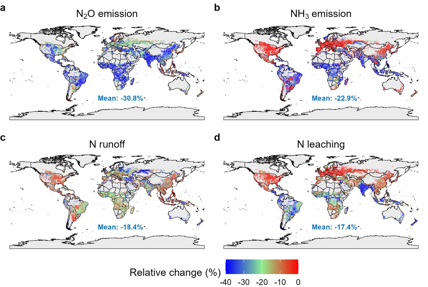 该研究评估了优化管理措施降低全球农田氮损失的潜力,在考虑当地气候、土壤条件和传统管理措施的背景下,可使全球范围内N2O排放、NH3挥发、氮径流和氮淋洗平均减少17-31%,为氮素可持续管理提供了理论支撑和科学证据。