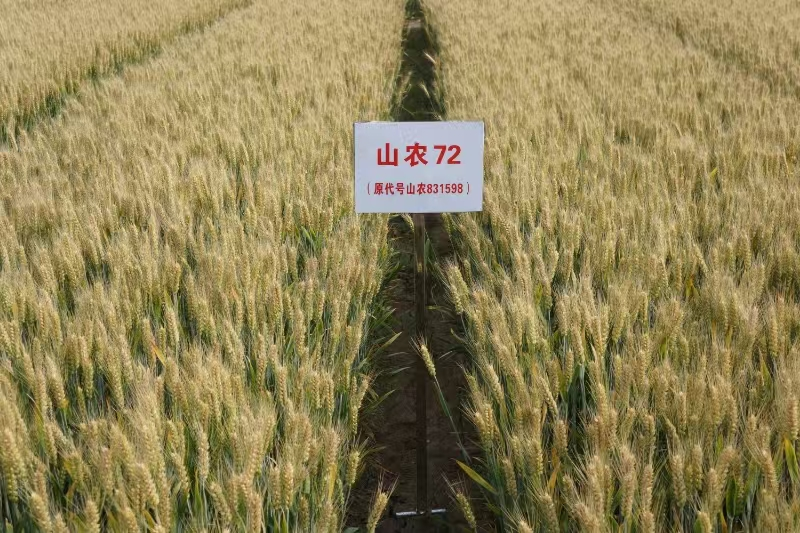 山农72号,审定编号:鲁审麦20240011。由孔令让教授团队选育,冬性,幼苗半匍匐,株型半紧凑,叶色黄绿,旗叶上举,熟相好。生育期比济麦22早1天;株高77.4厘米,抗倒性较好,亩最大分蘖83.8万,亩有效穗36.2万,分成穗率44.8%;穗长方形,穗粒数43.3粒,千粒重45.0克,容重800.0克/升;长芒、白壳,白粒、籽粒硬质。越冬抗寒性好。中抗白粉病,中感条锈病和纹枯病,高感叶锈病和赤霉病。籽粒蛋白质含量13.30-14.19%,湿面筋含量31.7-34.4%,沉淀值30m1,吸水率60.7-62.7m1/100g,稳定时间3.0-3.8min,面粉白度 73.7-74.8。2023-2024年高产组生产试验,平均亩产634.2公斤,比对照济麦22增产4.9%。