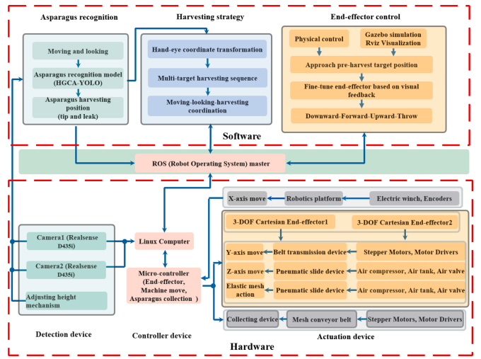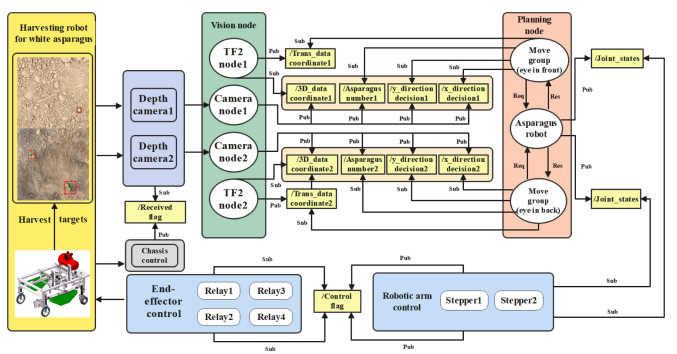 针对以上技术难题,山东农业大学苑进教授团队提出了一种选择性采收过程中笋芽识别、机械臂运动、末端执行器采收即“走-看-采”协同的控制策略以及双机械臂区域独立的高效采收协同算法,研究了基于ROS的多机械臂选择性采收智能控制系统,进行了软硬件系统集成、调试及优化,提高了作业效率,降低了漏采率。