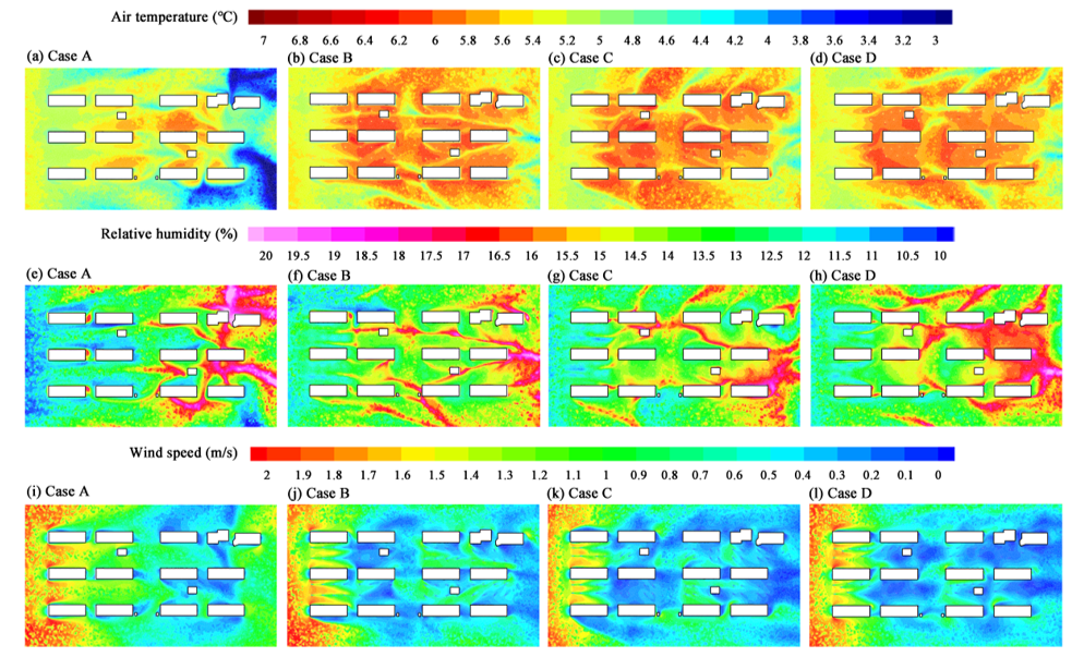 本研究利用现场测试和计算流体力学相结合方法,建立综合考虑树木、建筑等对气流阻力、湍流、遮阳效应等影响的精细化模型,揭示常绿乔木规则列植、团块种植和自然丛植等不同种植布局对泰安市居住区冬季小气候和室外热舒适的影响(图1)。研究表明,在低太阳辐射、高风速区,规则列植可有效避免局地风效应,改善小气候和室外热舒适;而团块种植和自然丛植更适合风速较低的区域。该研究为优化居住区绿地景观,提高住区冬季室外热舒适提供了有价值的见解,对改善城市微气候和提升居住区宜居性具有重要意义。