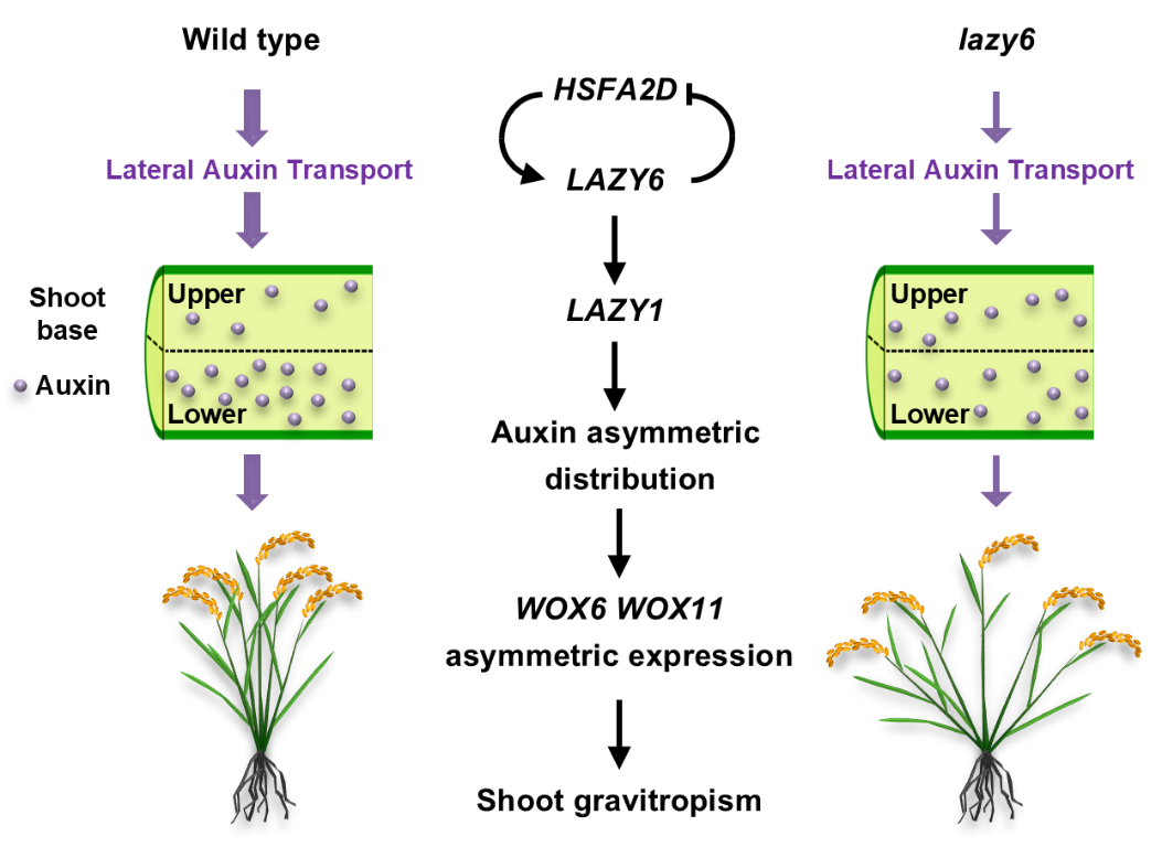 分蘖角度是作物株型的重要组成部分,对作物种植密度、群体光合效率以及最终产量具有重要影响。水稻分蘖角度的形成与重力反应密切相关。解析其背后的分子调控机制,不仅有助于揭示植物感知和响应重力的基本生物学过程,更对提高水稻群体产量具有指导意义。王永红教授团队长期致力于水稻株型研究,围绕重力反应调控的水稻分蘖角度系统开展研究,揭示了以HSFA2D-LA1-WOX6/11为核心的水稻分蘖角度遗传调控途径。近日,该团队与山东农业大学农学院张宁教授团队合作,在《New Phytologist》发表了题为“HSFA2D-LAZY6—LAZY1 module regulates shoot gravitropism and tiller angle in rice”的研究论文,揭示了LA6作为连接HSFA2D与LA1的关键因子调控水稻分蘖角度的分子机制,进一步完善了水稻分蘖角度的遗传调控网络。