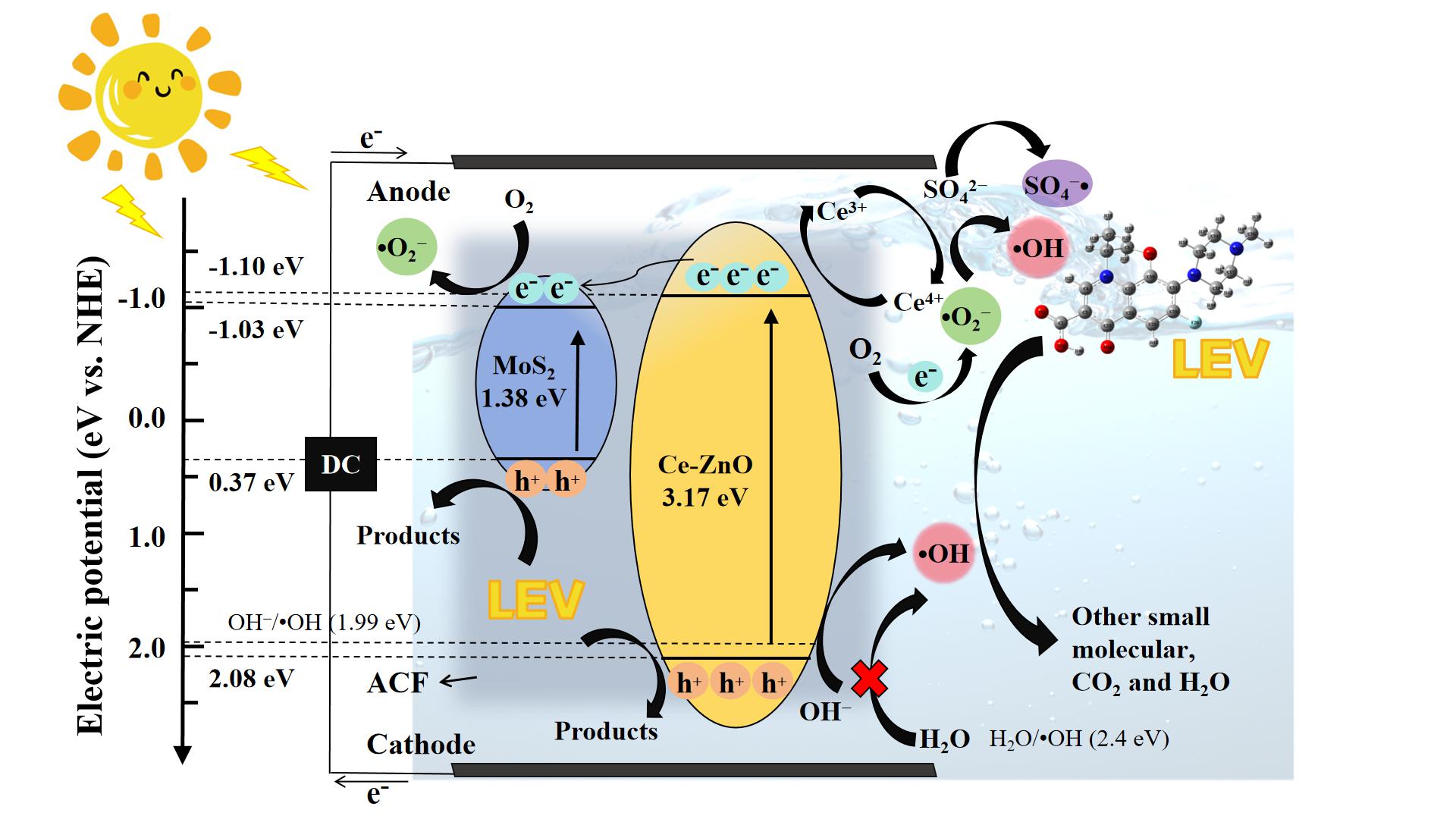 光催化技术(PC)作为一种环境友好的绿色技术,已广泛用于难降解有机物的去除。其是利用半导体在光照下会产生光生电子-空穴,从而生成各种活性自由基来去除污染物,然而传统的PC存在光能转化率低、反应速率慢等特点。该研究成功合成了Ce-ZnO/MoS2异质结并负载于活性炭纤维(ACF)上,并构建了光电协同(PES)体系。ZnO 与 Ce 和 MoS2的相互作用通过产生缺陷、优化能带结构以及增加活性位点显著增强了催化效果,促进了界面电荷转移以及电子和空穴对的分离。作为导电基底的 ACF 促进了电子迁移,同时解决了粉末状 Ce-ZnO/MoS2回收困难的问题。PES 系统实现了PC和电化学氧化的协同效应,以及左氧氟沙星(LEV)的高效降解(99.58%),主要活性物种为超氧自由基,对LEV的降解途径涉及哌嗪和羧基的损失、喹诺酮的破坏、脱氮和脱氟作用,该系统重复利用性高、成本低、可降低污染物生态毒性风险。该技术为有效去除难降解有机污染物提供了重要的理论和技术支持。