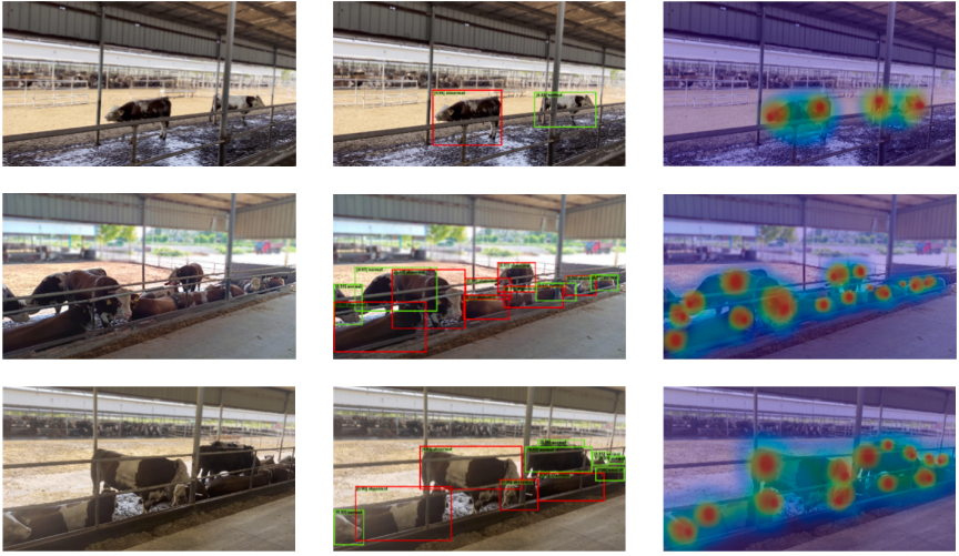 针对以上问题,团队提出了一种基于巡检机器人和时空特征融合算法(Cattle-ES3D)的肉牛呼吸急促和流涎行为检测方法(图1)。团队首先提出了一种混合架构,将嵌入式空间金字塔网络和SlowFast双通路网络集成在一起,实现肉牛行为时空特征的提取;其次,设计了自适应时空特征融合同步模块,实现时空特征的自适应融合;最后,设计了一个轻量级的动态检测分支,通过时空动态标签赋值驱动的多维参数优化机制,实现分类-回归特征空间对齐和时间关联约束。实验结果表明,该方法具有时空特征,提高了肉牛呼吸急促和流涎行为的检测精度,降低了计算成本。