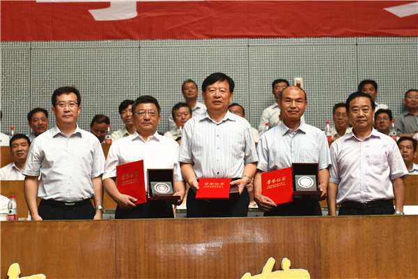 党委书记徐剑波、校长温孚江为山东农业大学第五届杰出校友颁奖。75级林业专业校友、中检验检疫学会会长、国家质检总局原副局长魏传忠;82级果树专业校友,中国农业大学党委常委、副校长王涛;80级陆地水文专业校友,山东省水文局总工程师、二级研究员宋承新获杰出校友称号。