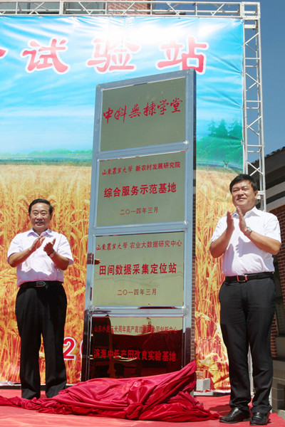 “渤海粮仓”科技示范工程是国家面向粮食安全在环渤海低平原区实施的重大战略,涉及我省德州、滨州、东营等地。自示范工程酝酿启动时起,我校赵庚星、贺明荣、诸葛玉平教授等科研人员即参与其中。2014年3月15日,学校与无棣县人民政府签署协议,面向盐碱地绿色改良与生态利用、粮食安全、精准扶贫等国家战略,在该县典型盐碱地区建设高效生态农业综合服务示范基地,推进产学研无缝链接,安排30余项科研课题在无棣试验示范。去年10月和今年8月,3栋高标准智能温室大棚和1幢综合试验楼先后投入使用。