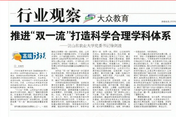 3月30日,《大众日报》以“推进‘双一流’打造科学合理学科体系”为题,刊发记者对山东农业大学党委书记徐剑波专访。