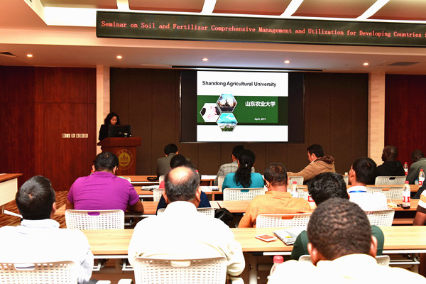 在校期间,来自南苏丹、加纳、尼泊尔、斯里兰卡4个国家的28名农业官员和专业技术人员完成了课堂学习、站园参观等研修内容。资源与环境学院王金花教授和杨越超教授分别做了“农业污染与防治”、“ 新型肥料研发”的主题报告,就土壤污染防治、缓释肥研发及应用等问题与学员进行了深入探讨。学员还参观了作物生物学国家重点实验室,南校区园艺试验站、国家苹果工程技术研究中心、水肥渗漏研究池、土水重量及渗滤水质实时监测及肥料养分循环模拟装置等,对我校的办学成就给予高度评价。