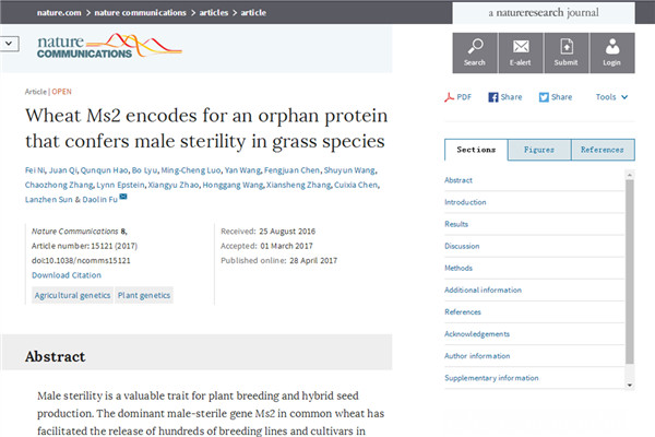 山东农业大学付道林教授领衔的科研团队在太谷核不育小麦研究方面取得重大突破,成功克隆太谷核不育基因并对其机理进行了探讨,为将来实现小麦等作物的杂交制种创造了条件。4月28日,国际著名学术期刊《自然通讯》(Nature Communications)以《小麦Ms2基因编码的稀有蛋白导致禾本科植物的雄性不育》(Wheat Ms2 encodes for an orphan protein that confers male sterility in grass species)为题发表了他们的研究成果。