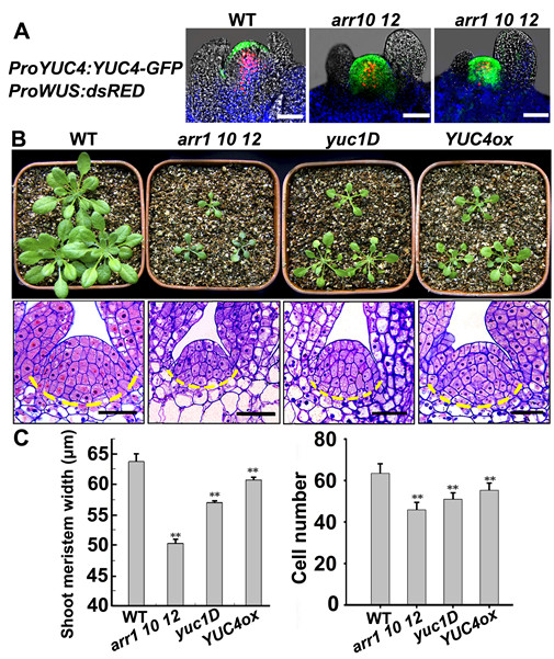细胞生物学和遗传学的手段证明细胞分裂素与生长素的细胞分裂素响应调节因子ARRs通过调节生长素合成调控干细胞维持