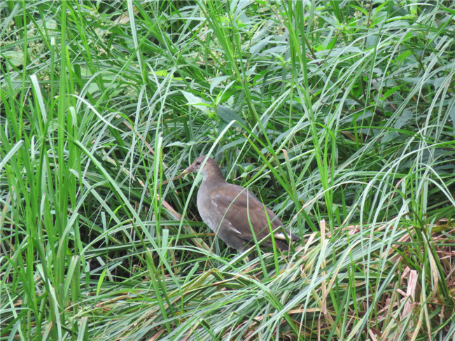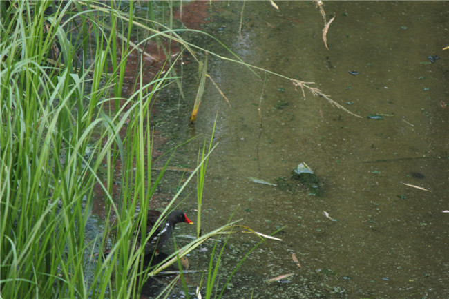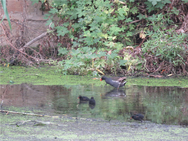 黑水鸡,河道内的另一种“野鸭子”。成鸟鲜红的鼻甲和深色的身体是它们的识别特征。同样的,黑水鸡也在校内繁殖,我们记录了它们从圆滚滚的小黑团子长成大鸟的过程。