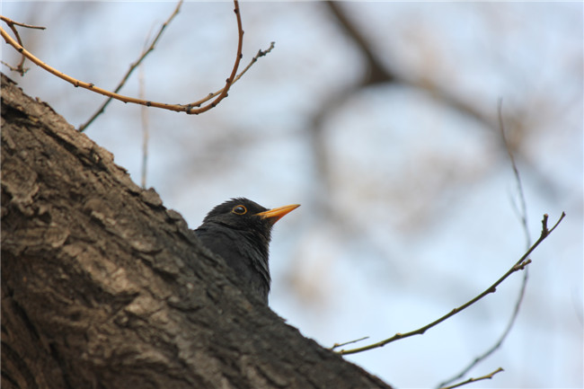 纯黑色的身体,鲜黄的嘴和眼圈就是乌鸫的识别特征。注意了,乌鸫可不是乌鸦,它的叫声很好听,又名“百舌”。每年春天,起的早些,你就能听到树林里乌鸫们婉转美妙的叫声。