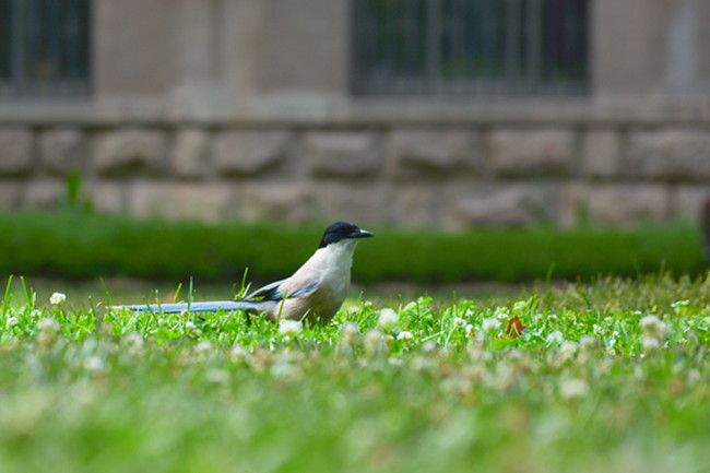 虽唤之喜鹊,却只是“远房亲戚”。惊而振翅,时而能被它的“姿色”惊艳。然而它们可不是“吃素”的,一个不如意,往往会来次不大不小的突然袭击。当然,停放在树下的车上也经常会留下它们独有的标记。