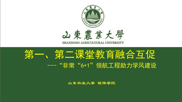 植保学院:在全校率先开展“第二课堂成绩单”试点工作,实施了非常“6+1”领航工程,结合“三导式”学业规划的实践积累,围绕第一课堂和第二课堂融合互促的一条主线,做好四个结合,搭建六大平台,改革四大体系。形成了“1464”二课培养模式,推进学院优良学风建设,助力学生成长成才。
