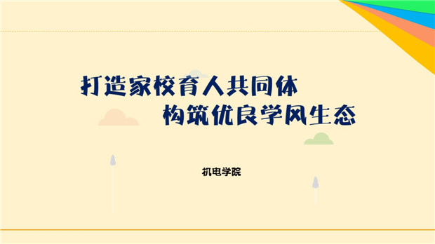 机电学院:1533家校协同育人模式,以“学生接受为中心,以学校教育为主导,以家庭教育为助力”为机制,以“学风、安全、思想、双创、行为养成”为五大内容,以“四心教育、四访、致家长一封信”为载体,以“家校联络员、新媒体平台、传统媒介”为平台,架构起了家校育人共同体,生动打造了良性互动、长效共育的学风生态新格局。