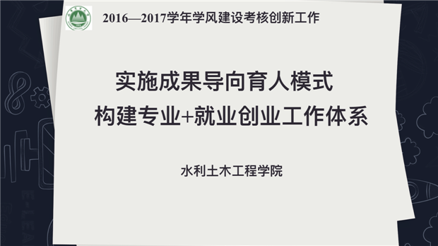 水土学院:基于成果导向育人(OBE)模式下构建专业+就业创业工作体系,以专业为基础载体开展就业和双创工作,并设计了专业双创的“十个一”工程,学院就业、创新创业工作取得了丰硕成绩,以此促进优良学风的养成。