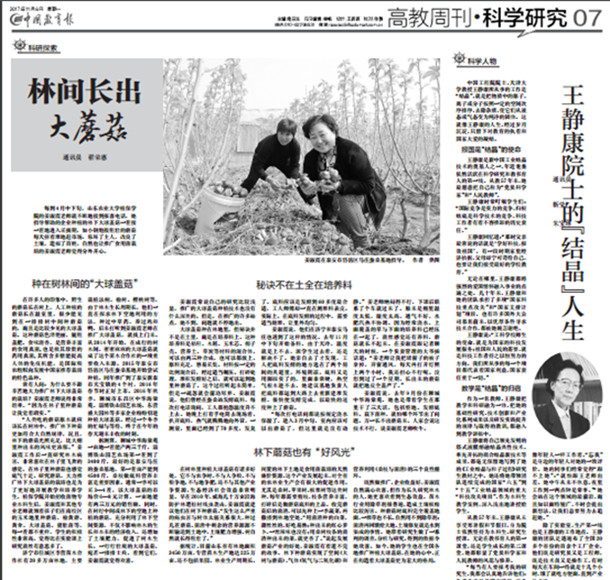 11月6日,《中国教育报》以接近二分之一个版面,详细报道了山东农业大学助力林下经济发展的办学经验。文章以植保学院姜淑霞老师指导帮助企业种植林下大球盖菇为例,称赞该项技术用活、用好了林下闲置土地,在取得显著经济效益的同时,增加了土地肥力,实现了生态化可持续发展,赢得了群众广泛欢迎。文章指出,目前仅山东省就有林地面积3450万亩,专营苗木生产地达225万亩(不包括果园),山东农大相关技术的推广应用,对于充分发挥闲置林下土地的经济潜力,促进农林业生产具有重要意义。